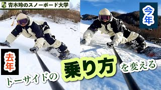 トーサイドの乗り方【お尻の出ないシルエット】去年も乗っている感じは良かったですが、シーズンインから乗り方を変え始めました。まだまだ研究中。ちょっとお尻をしまうようにしたら乗り味もよくなった!